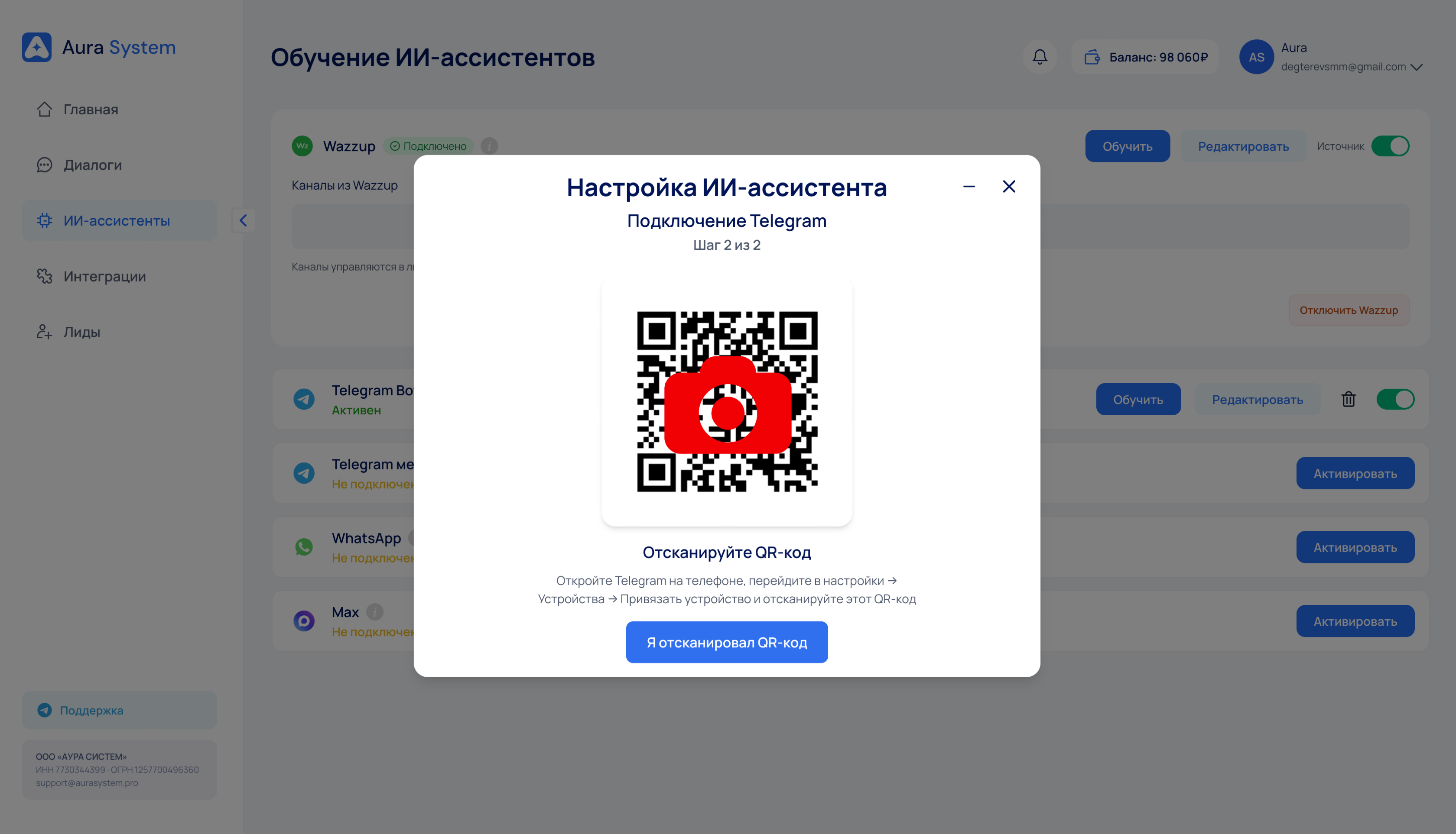 Система предложит подключить аккаунт Telegram.